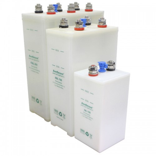 EBL - представляет собой малообслуживаемый тип, который применяет для длительных глубоких разрядов от 1 до 100 часов. Модельный ряд состоит из аккумуляторов емкостью от 10 до 1210 А/ч с номинальным напряжением элемента - 1,2В.